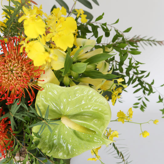 We've added some unique anthuriums to this arrangement. It's easy to decorate and will brighten up any celebration, such as a birthday or wedding anniversary.