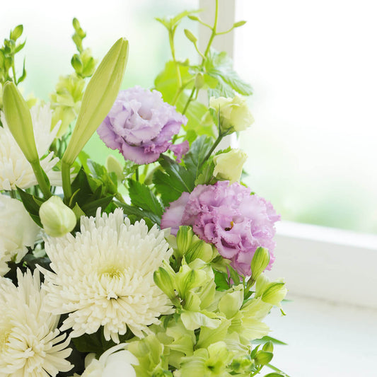 [Main flowers] Lilies (Siberian), chrysanthemums (Anastasia), carnations, lisianthus (white or exo-lavender), etc.