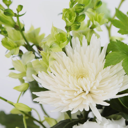 The soft, fluffy petals of the lisianthus create a soft impression. The overall arrangement has a natural and mature feel. The muted colors make it perfect for formal occasions.