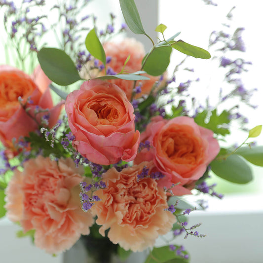 중심에서 펼쳐지는 오렌지 그라데이션이 아름다운 장미를 사용한 꽃다발.