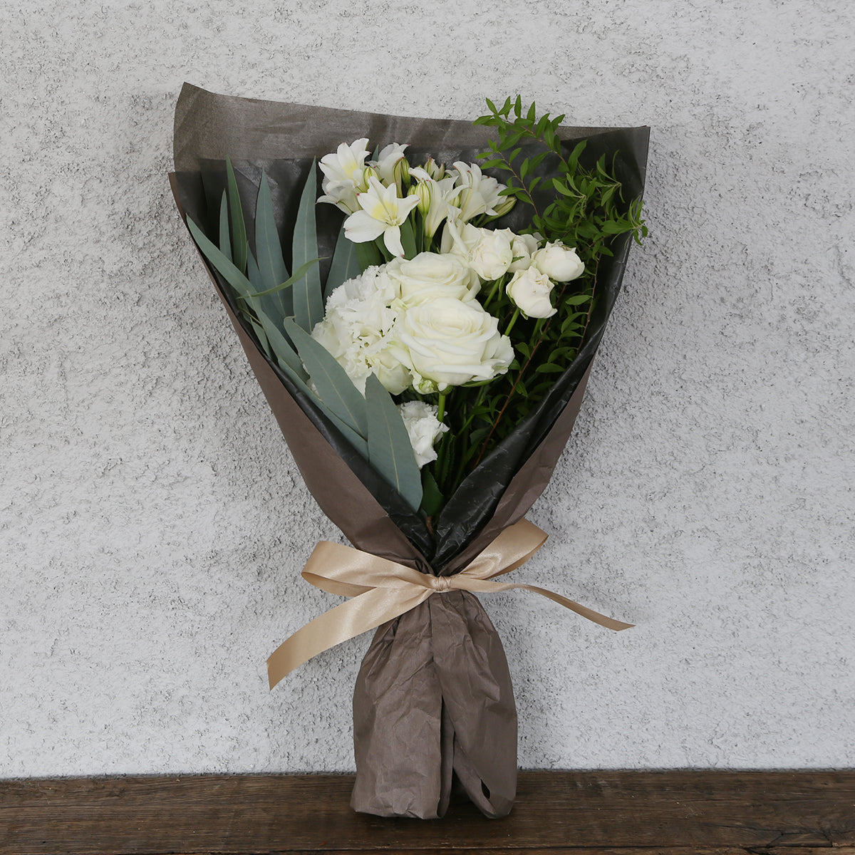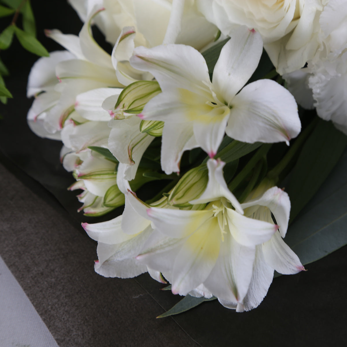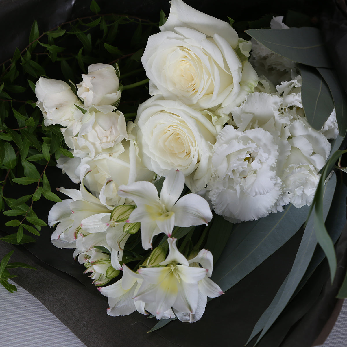 真っ白なバラとトルコキキョウをメインにした、ナチュラルで大人っぽい雰囲気の花束。落ち着いた色合いで、フォーマルな場面にもぴったりです。