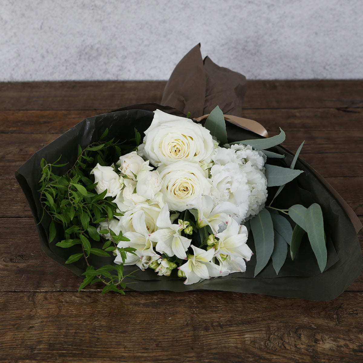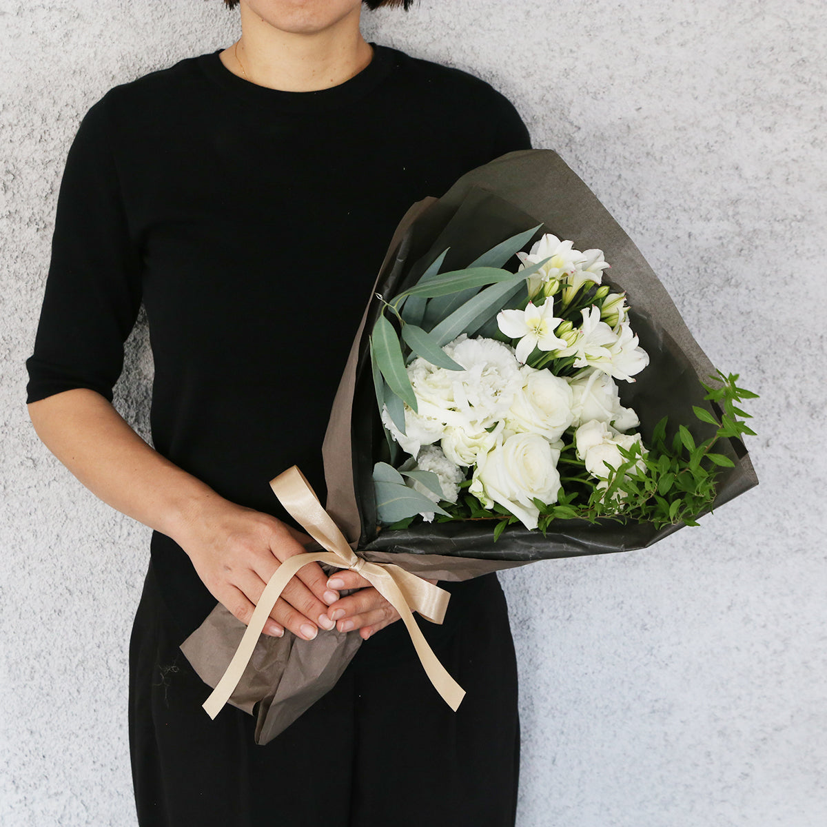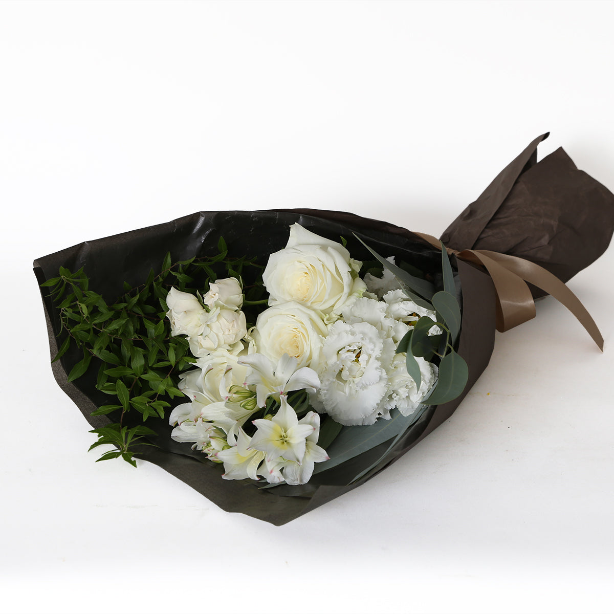 真っ白なバラとトルコキキョウをメインにした、ナチュラルで大人っぽい雰囲気の花束。落ち着いた色合いで、フォーマルな場面にもぴったりです。
