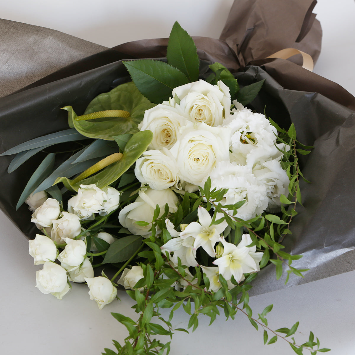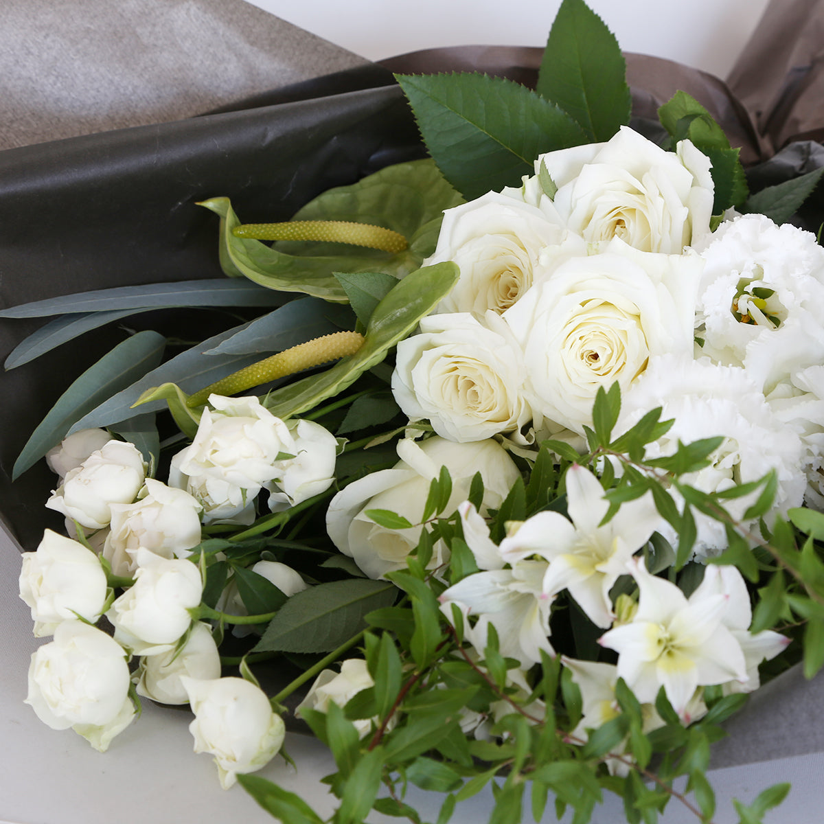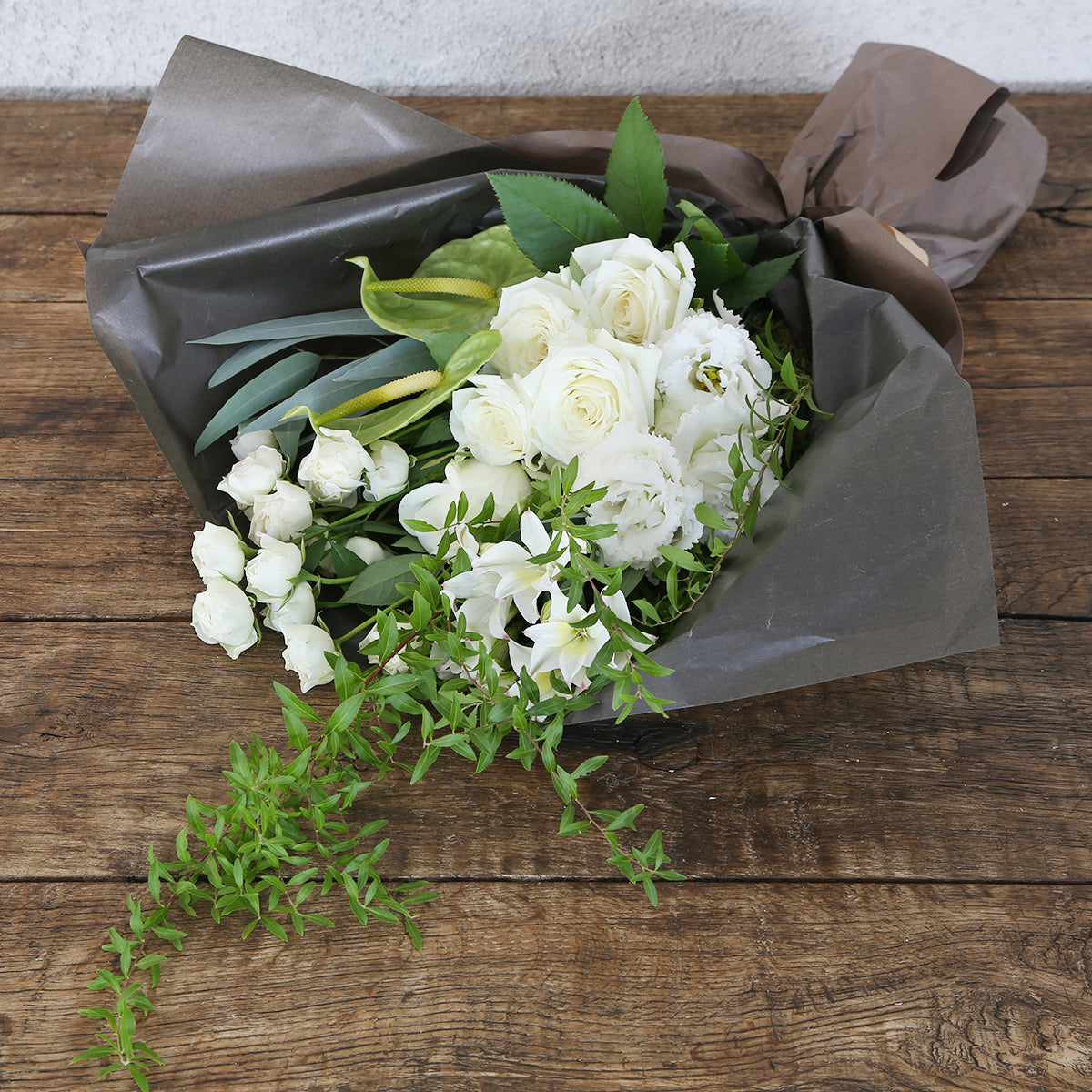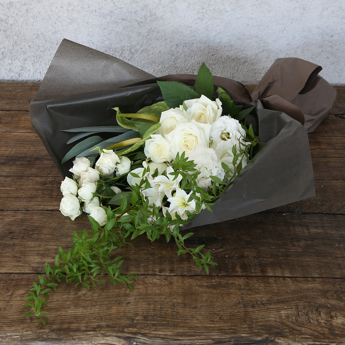 清楚な白いバラをメインにした、ナチュラルで大人っぽい雰囲気の花束。落ち着いた色合いで、フォーマルな場面にもぴったり。たっぷりと束ねられた花は、誕生日や退職、贈呈用など節目のお祝いを華やかに彩ります。