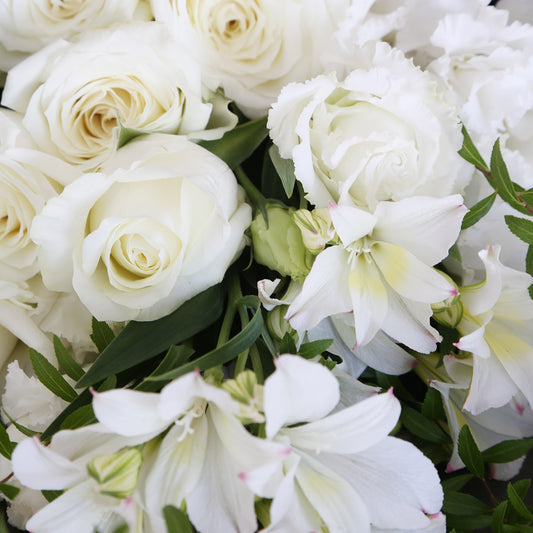 清楚な白いバラをメインに、ナチュラルで大人っぽい雰囲気の花束。フォーマルな場面にも安心な色合いです。両手いっぱいに抱えるほどの花は、喜びで満ちあふれます。