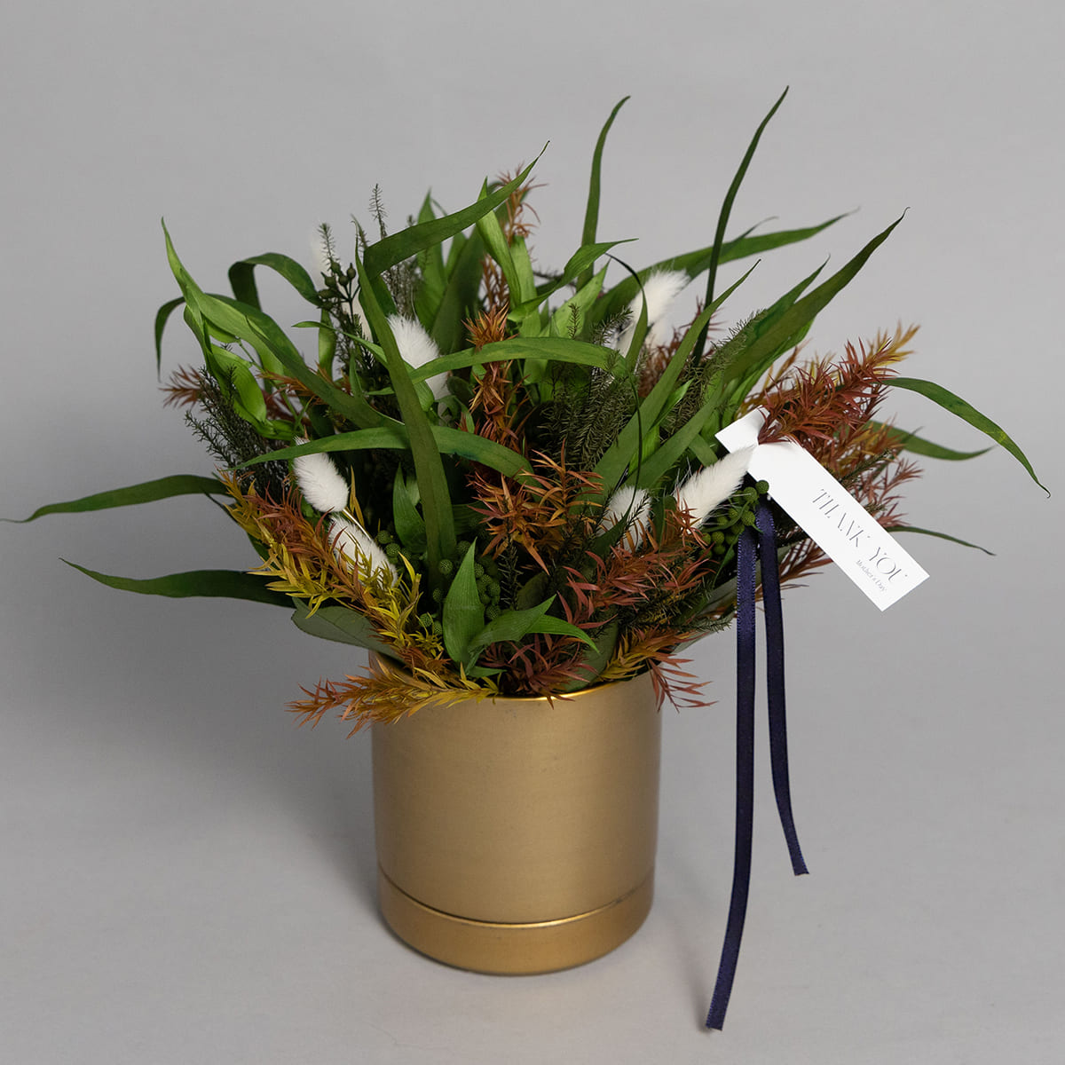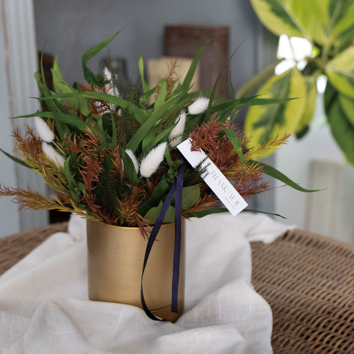 ゴールドの器にのびやかにアレンジしたのは、瑞々しい質感をそのままに残した深緑の葉と、軽やかに空を舞うような白いラグラス。