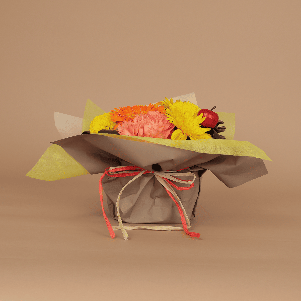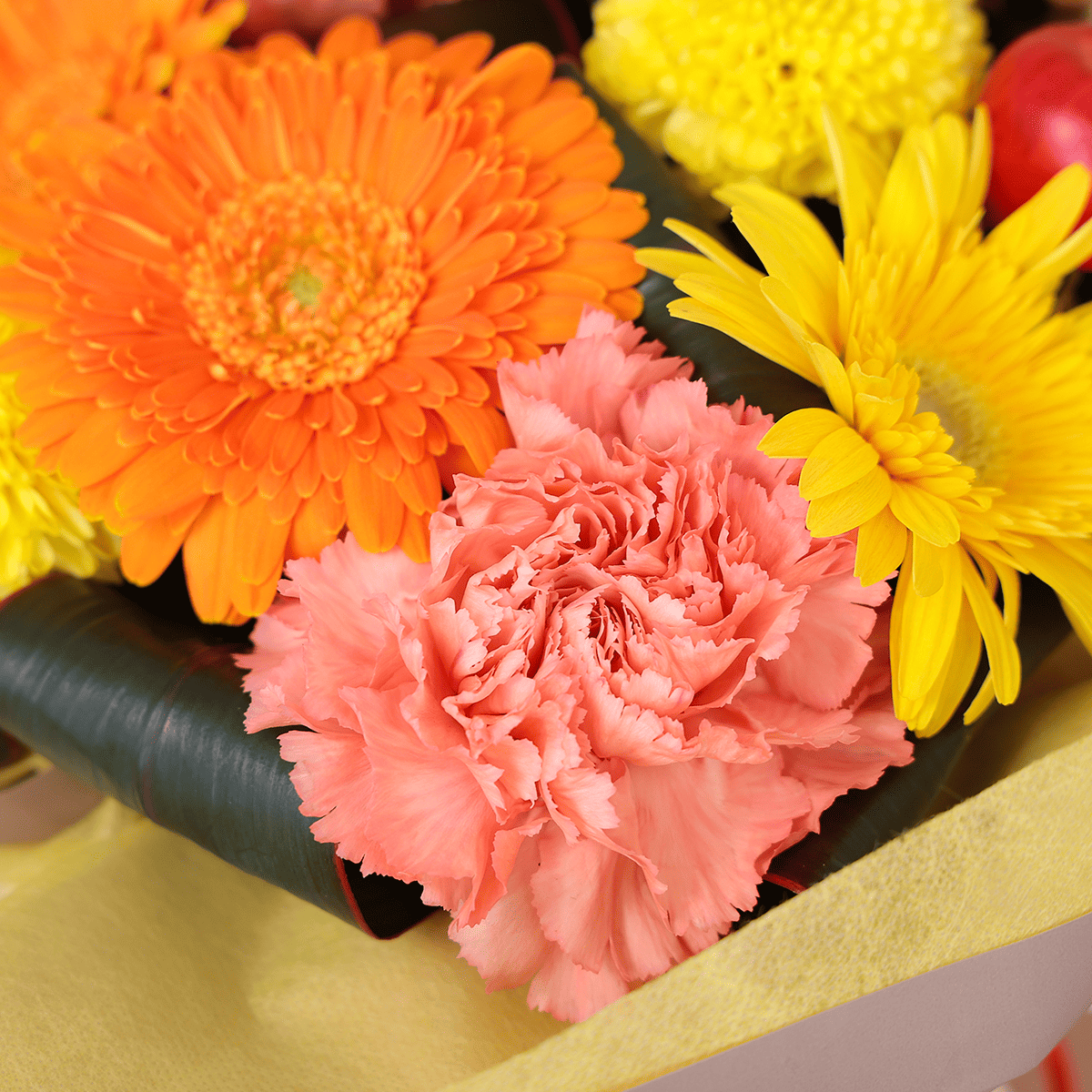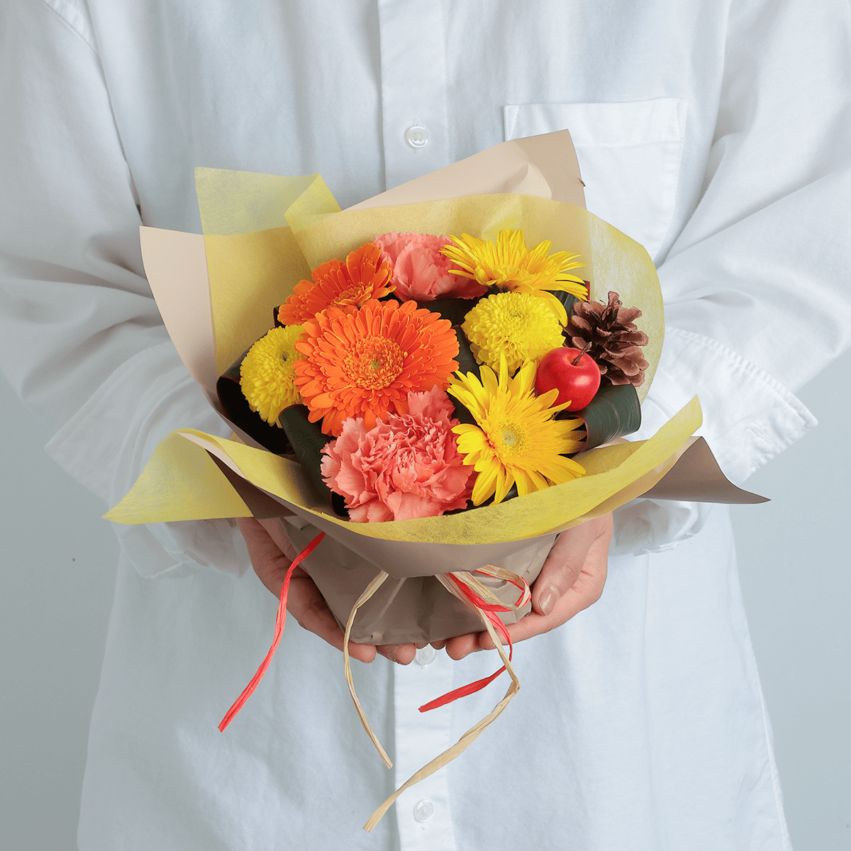 鮮やかなオレンジのガーベラや、やさしい黄色のスプレーマム、可憐なピンクのカーネーションが織りなす彩りは、まるで秋の陽だまりのような温もりを届けてくれます。