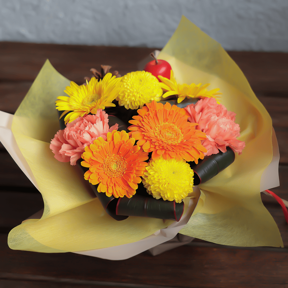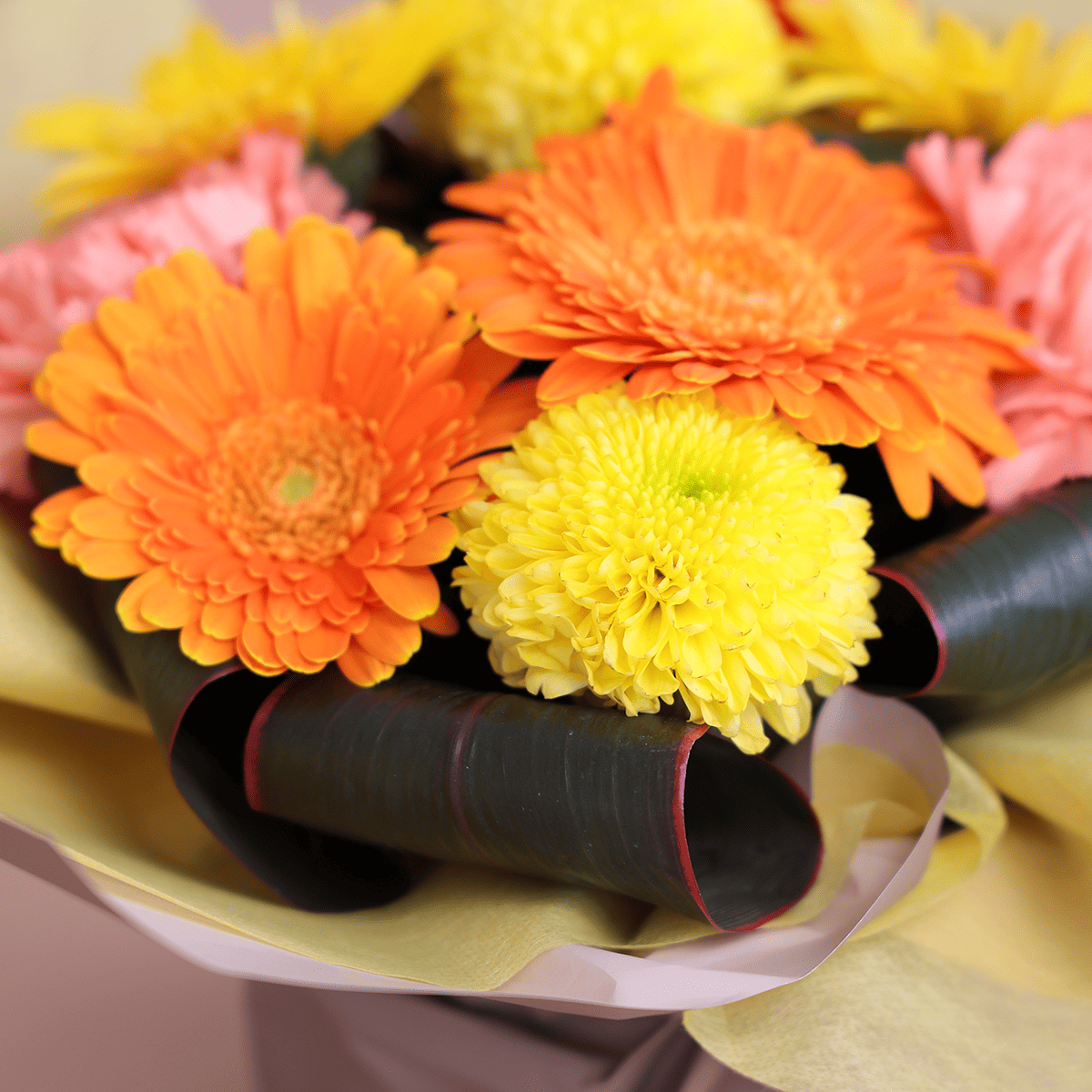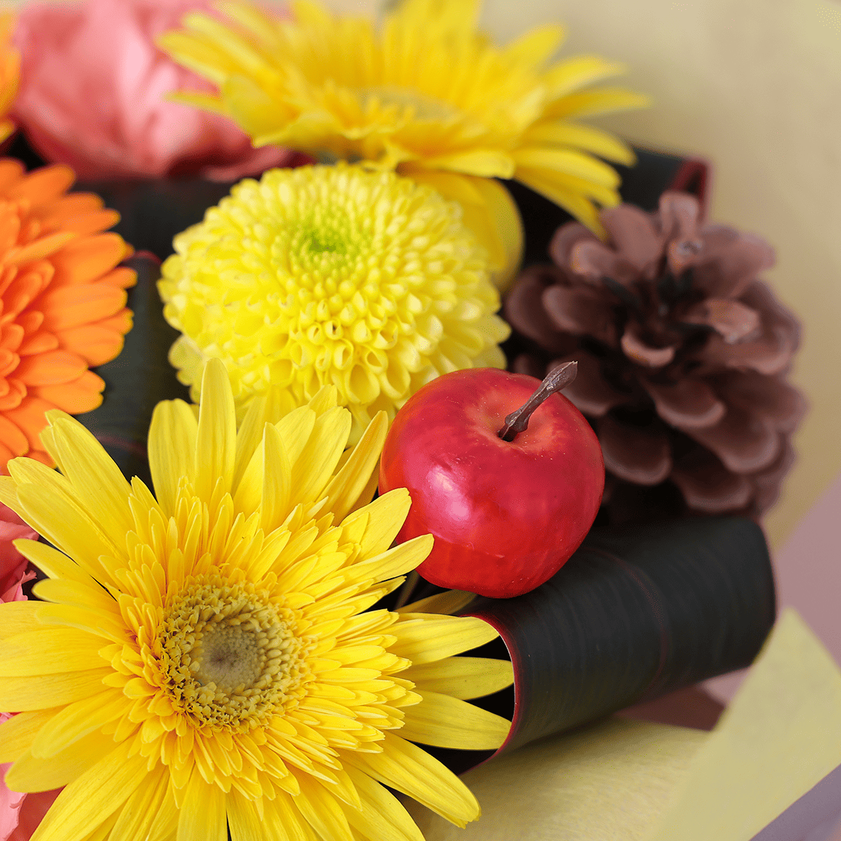 鮮やかなオレンジのガーベラや、やさしい黄色のスプレーマム、可憐なピンクのカーネーションが織りなす彩りは、まるで秋の陽だまりのような温もりを届けてくれます。