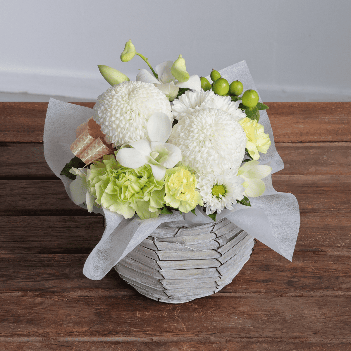 故人への想いをお花に込めて。白いピンポンマムと凛とした姿が美しい白色のデンファレを中心に、ライトグリーンのカーネーション、淡いイエローのスプレーマムなど清らかな雰囲気の花々をあわせ、丸いフォルムはお届け先に温かみを感じさせてくれます。