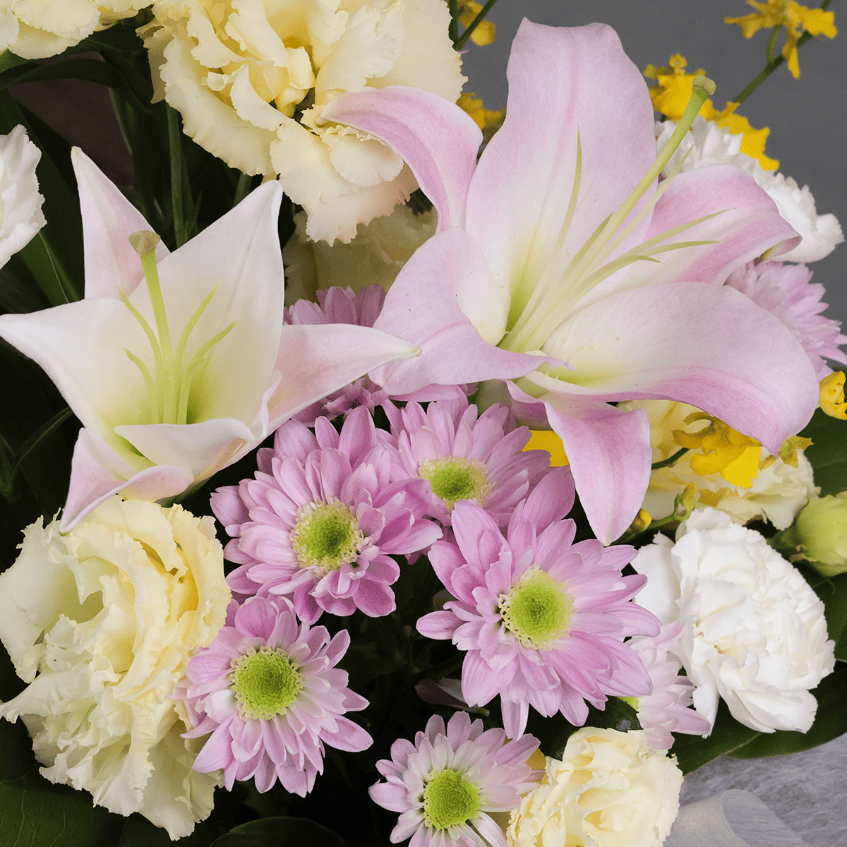 ユリ、スプレーマム、カーネーション、トルコキキョウ、オンシジウムなど