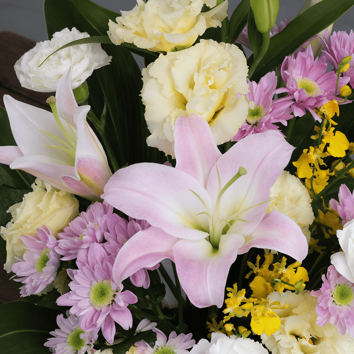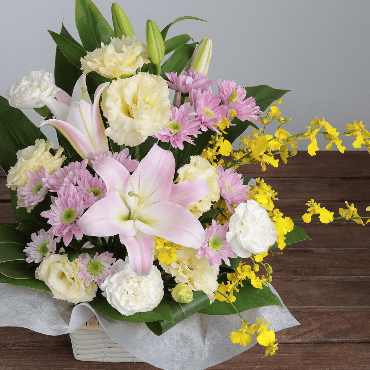 あたたかな気持ちを伝えるピンクのユリと華やかな黄色のオンシジウムを取り合わせた高級感のあるお供え用アレンジメントです。