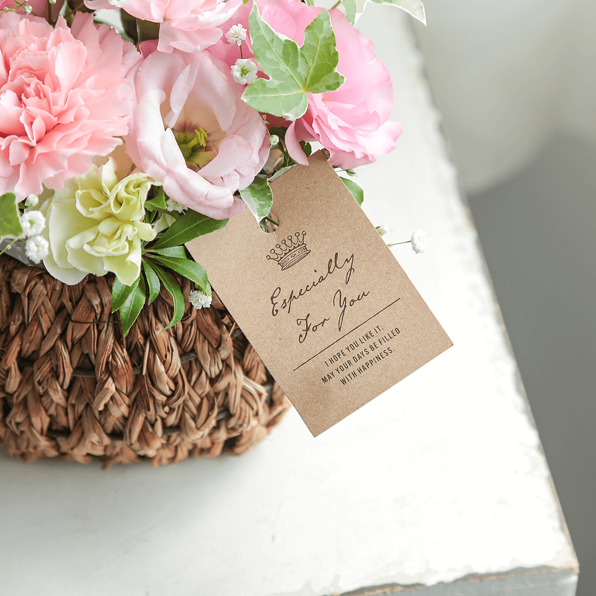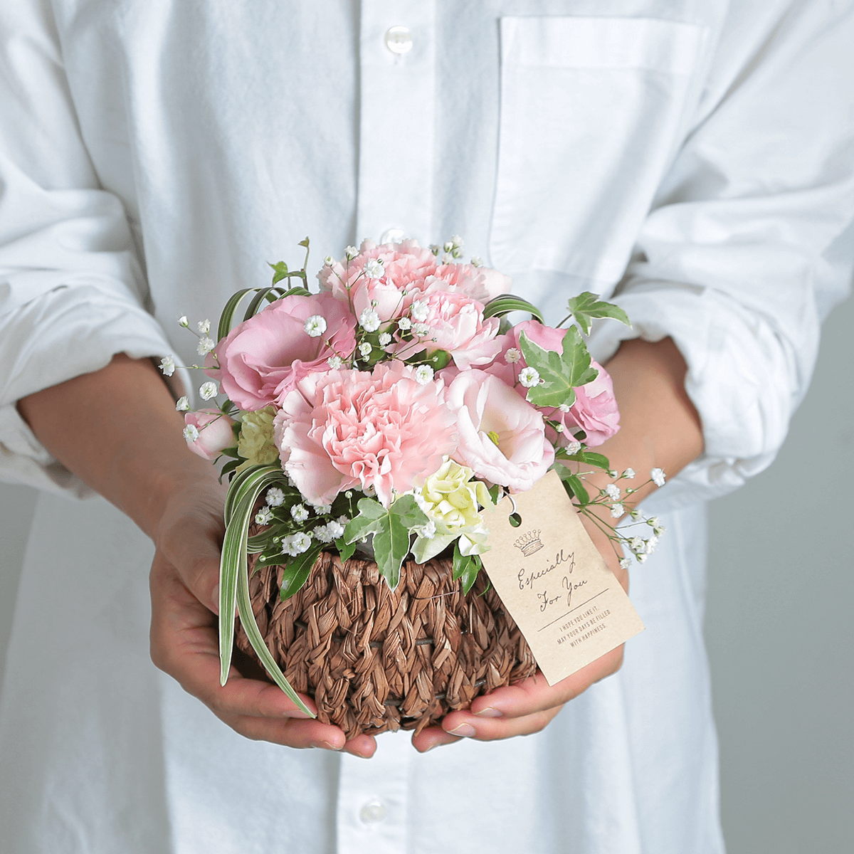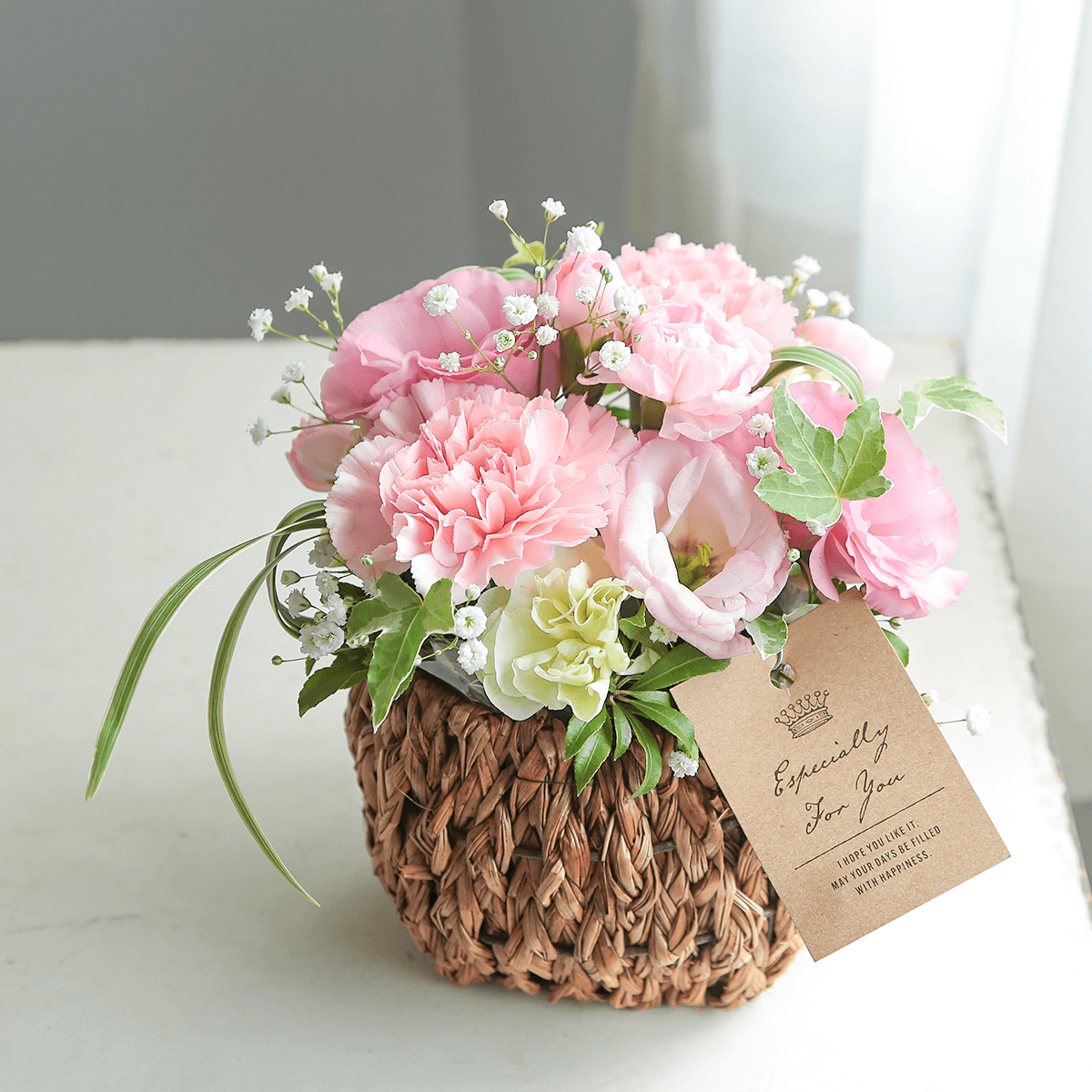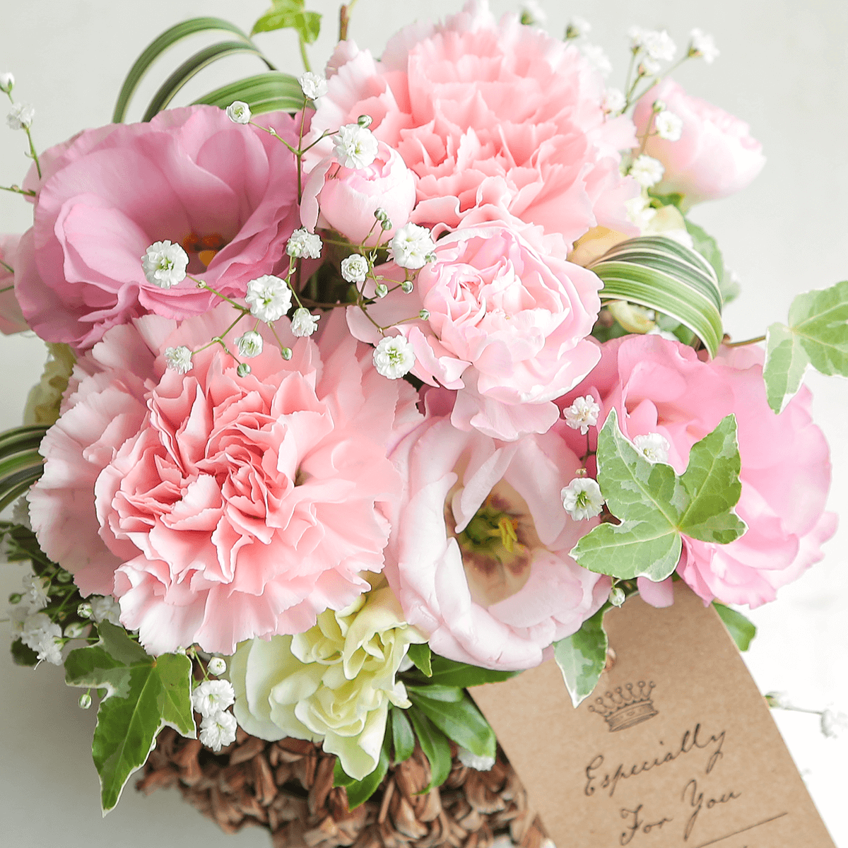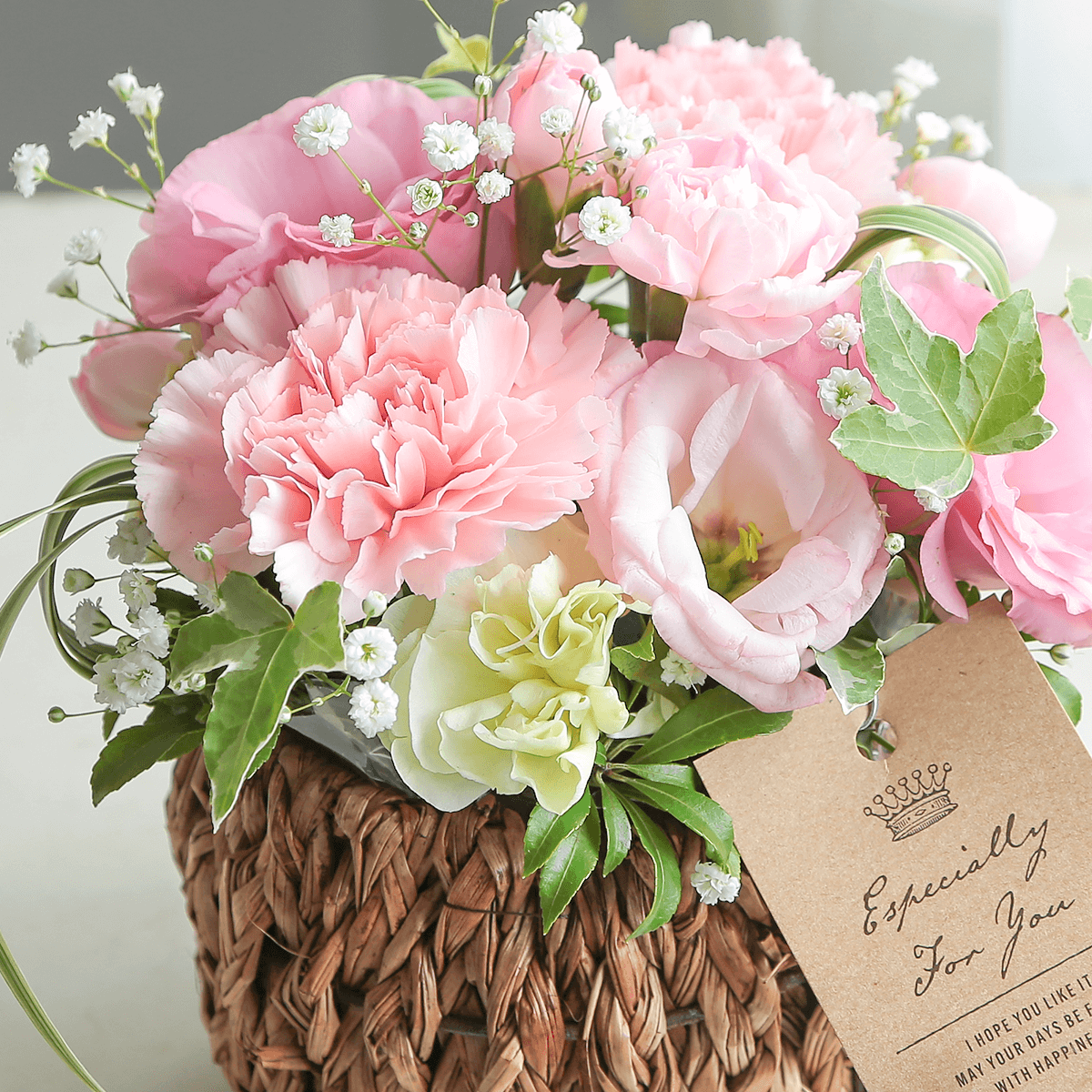 淡いピンクのお花に、ふんわりカスミソウと斑入りのグリーンリーフ2種を組み合わせて、見ているだけで心がホッとするようで優しく癒やされます。ざっくりと編み込んだデザインの器とタグでナチュラルな雰囲気を演出。