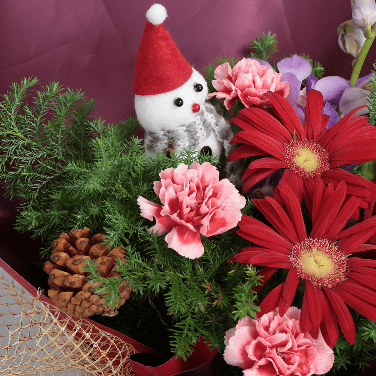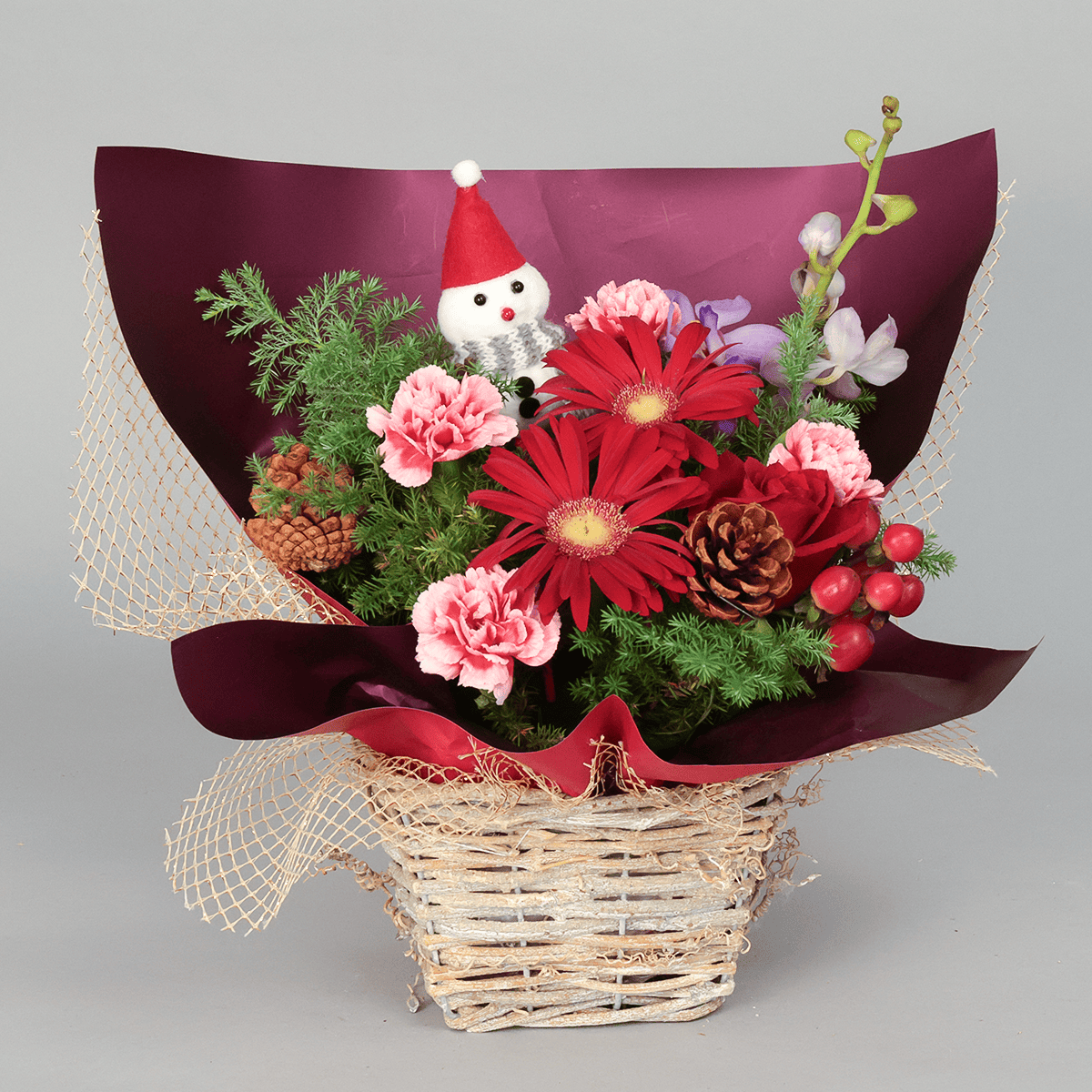 真っ赤なガーベラやカーネーションが彩る、にぎやかであたたかなクリスマスアレンジメントです。