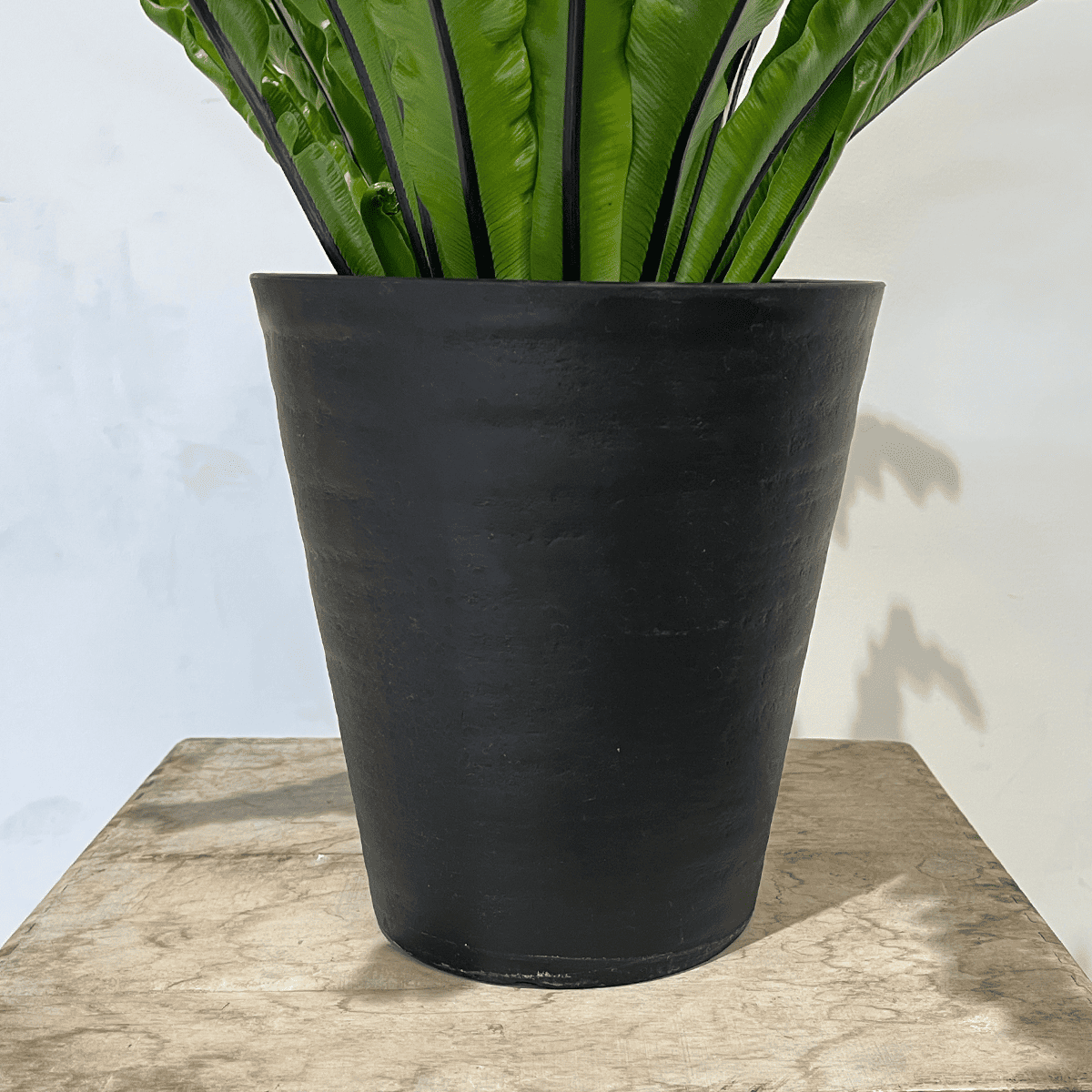 黒のスタイリッシュな鉢が植物のフォルムを引き立て、モダンなインテリアにぴったり。