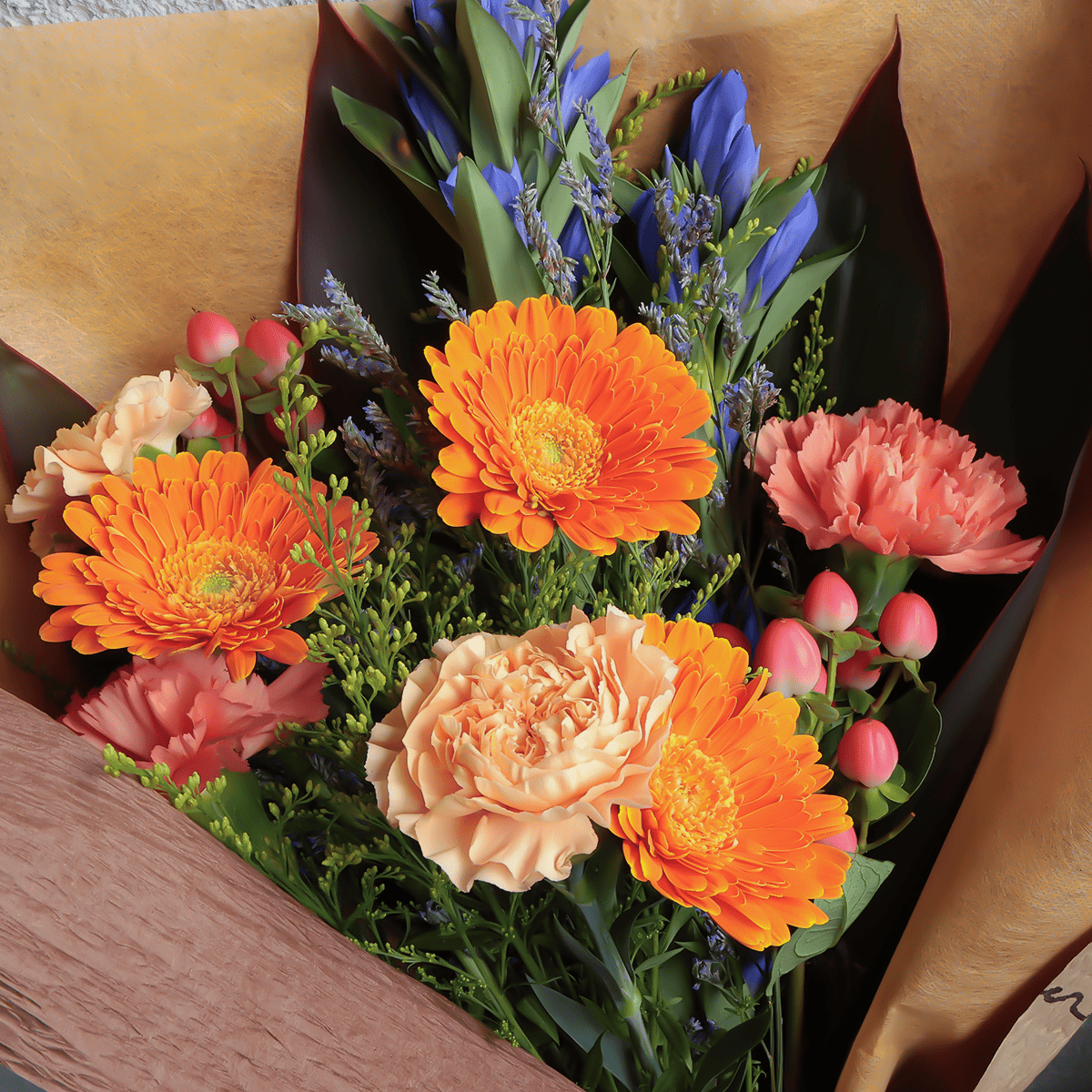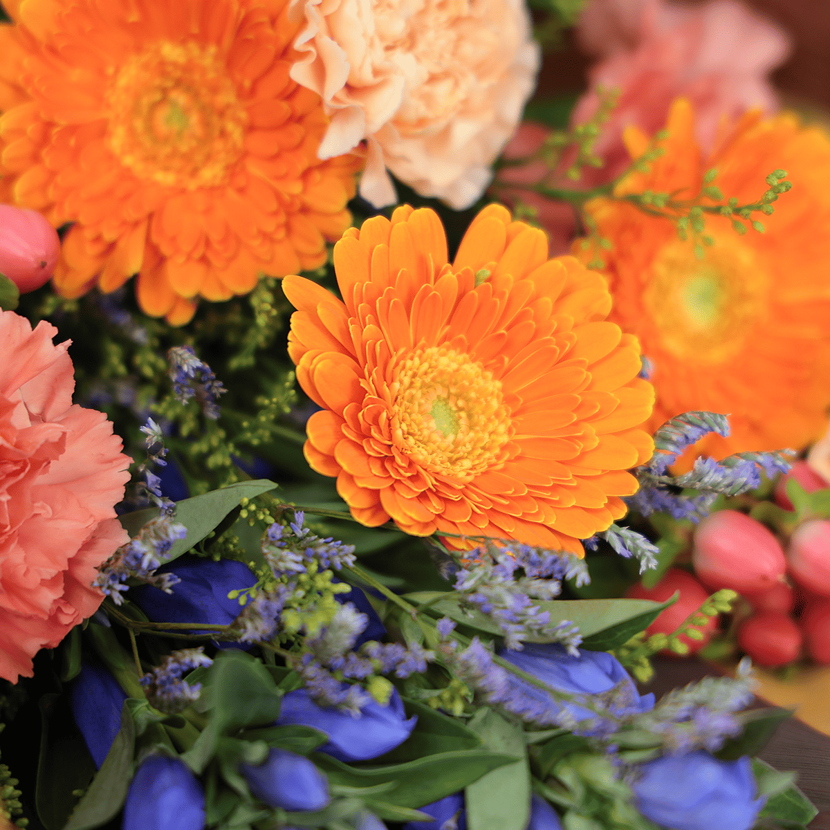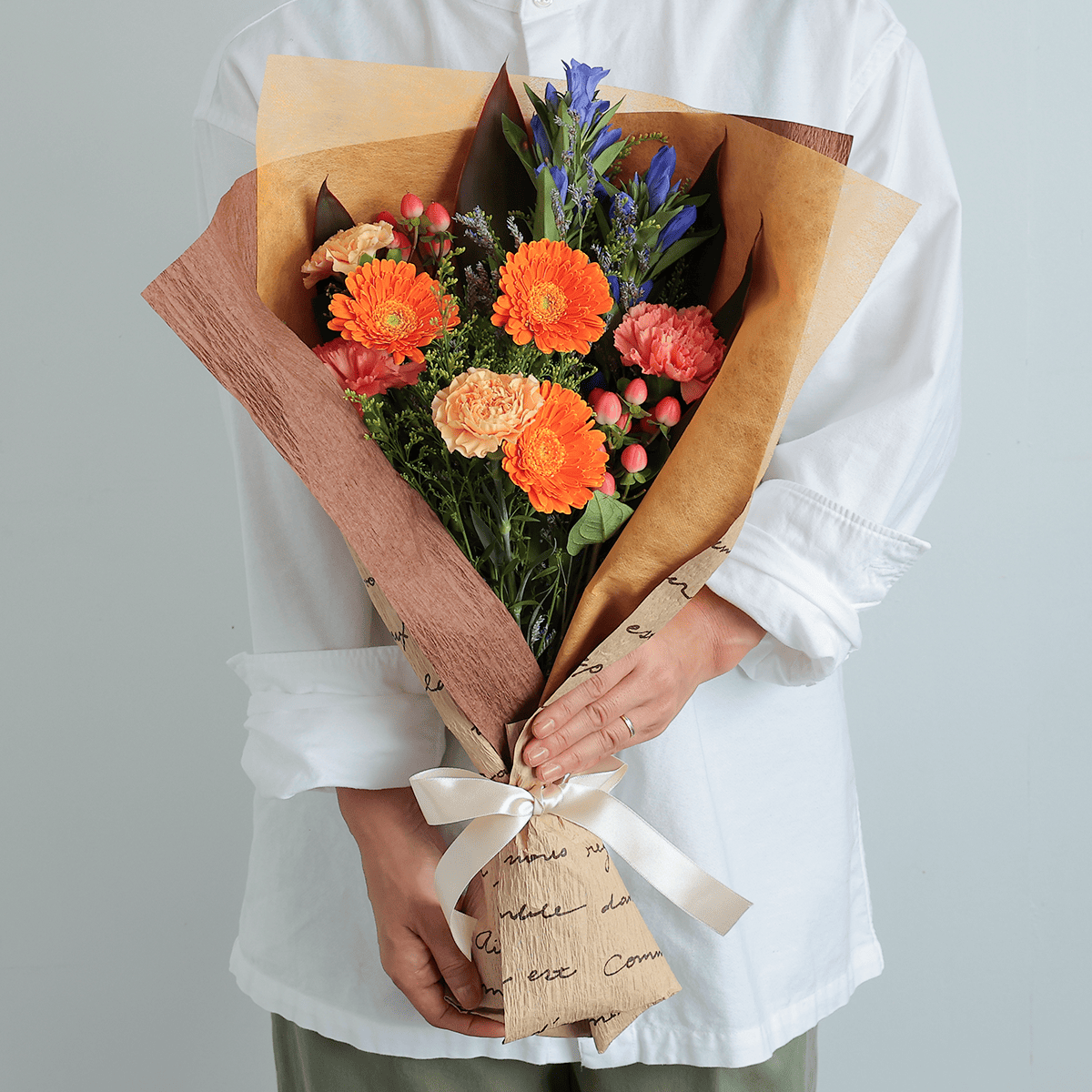 鮮やかなオレンジのガーベラとカーネーションが、秋の陽だまりのような温もりを感じさせる花束。