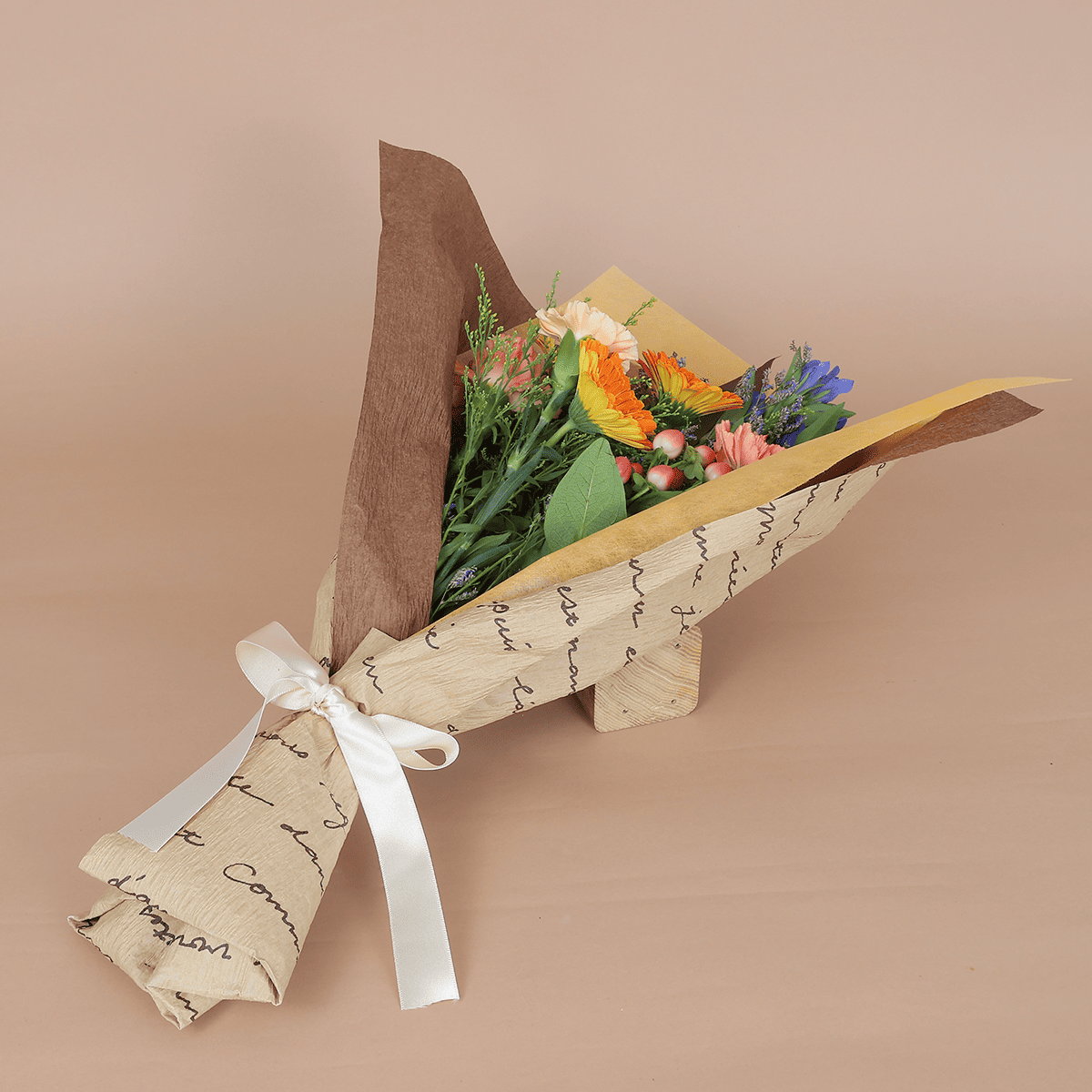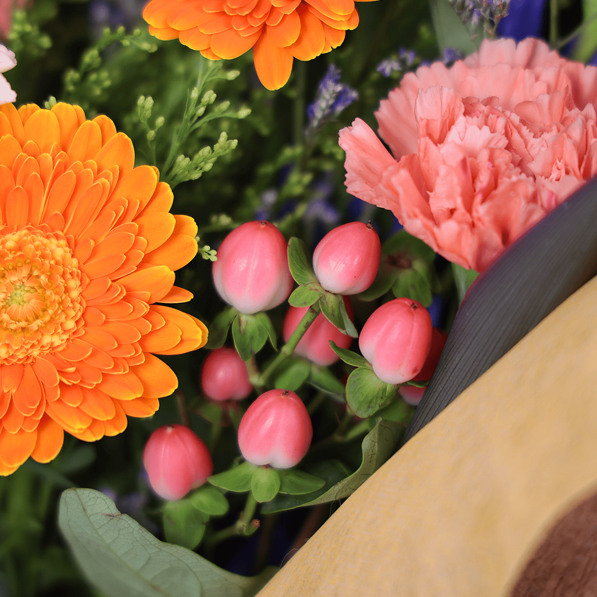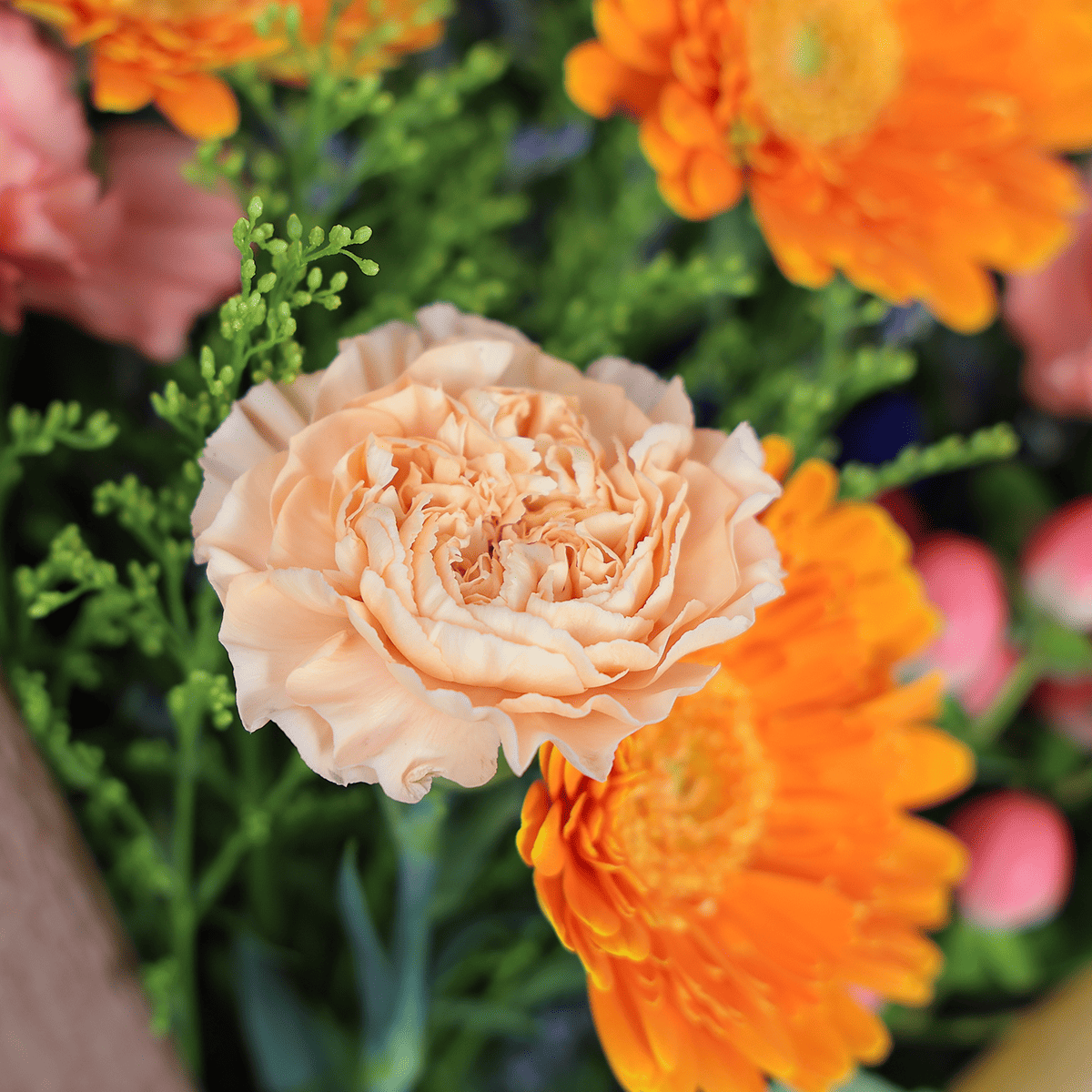 鮮やかなオレンジのガーベラとカーネーションが、秋の陽だまりのような温もりを感じさせる花束。