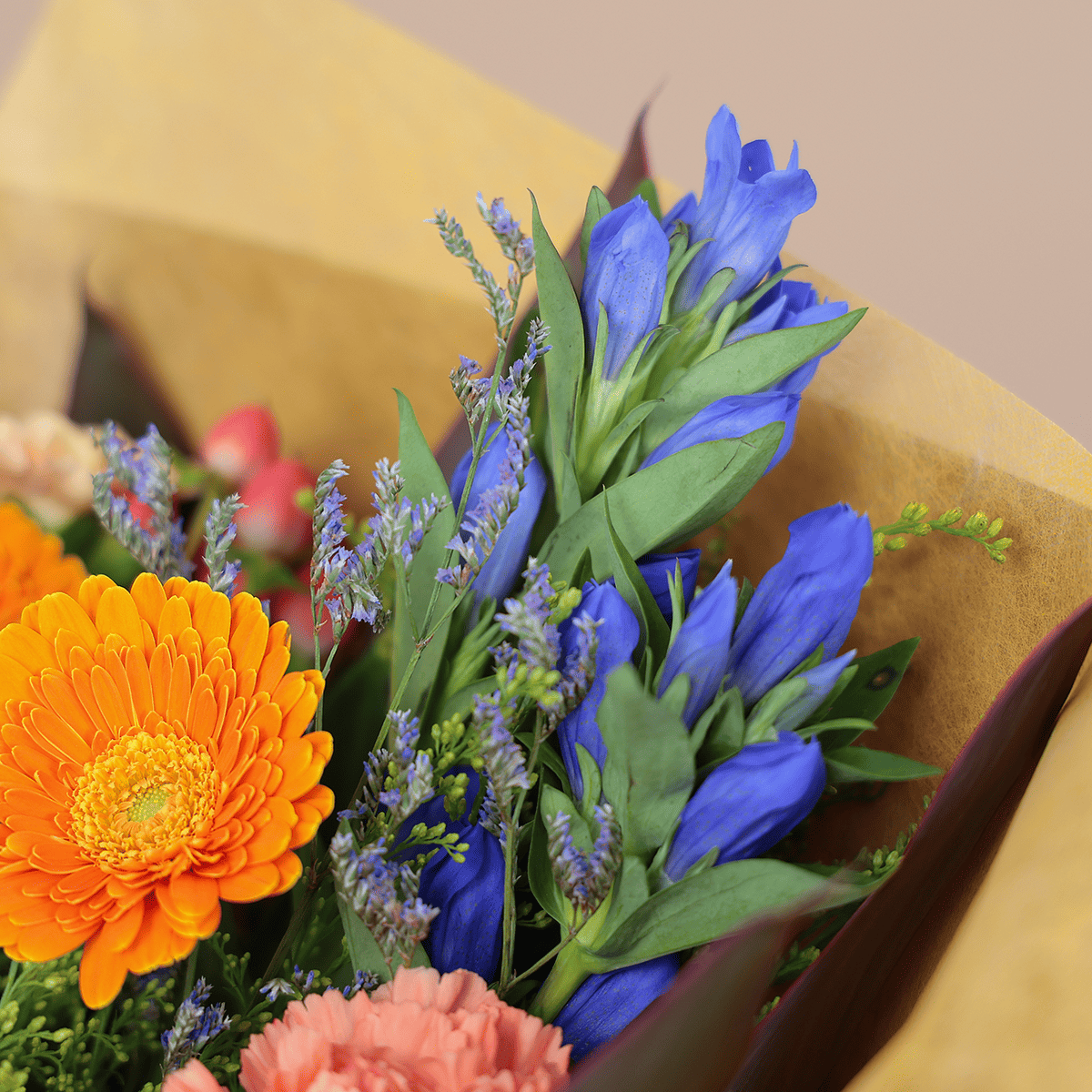 ガーベラ、カーネーション、リンドウ、ヒペリカムなど